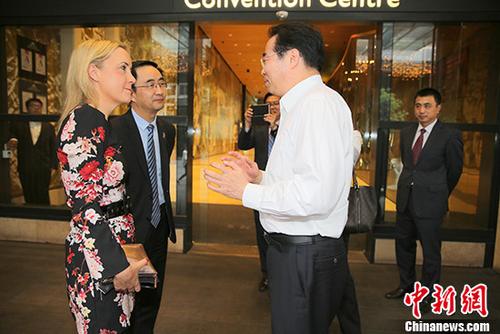 11月26日晚,中国国务院侨办党组书记、副主任许又声在奥克兰会见新西兰青年发展部前部长妮基·凯伊。 中新社记者 陶社兰 摄